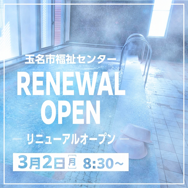 この度、玉名市福祉センターの中規模改修工事が完了し、浴場・休憩室や会議室等が利用できるようになりました。工事期間中は、皆さまには大変ご迷惑をおかけしました。 これからも皆さまの健康増進と安心して生活していけるための福祉活動の拠点施設として努めてまいります。 皆さまのお越しを心よりお待ちしております。 〈営業開始〉令和8年3月2日(月)午前8時30分より